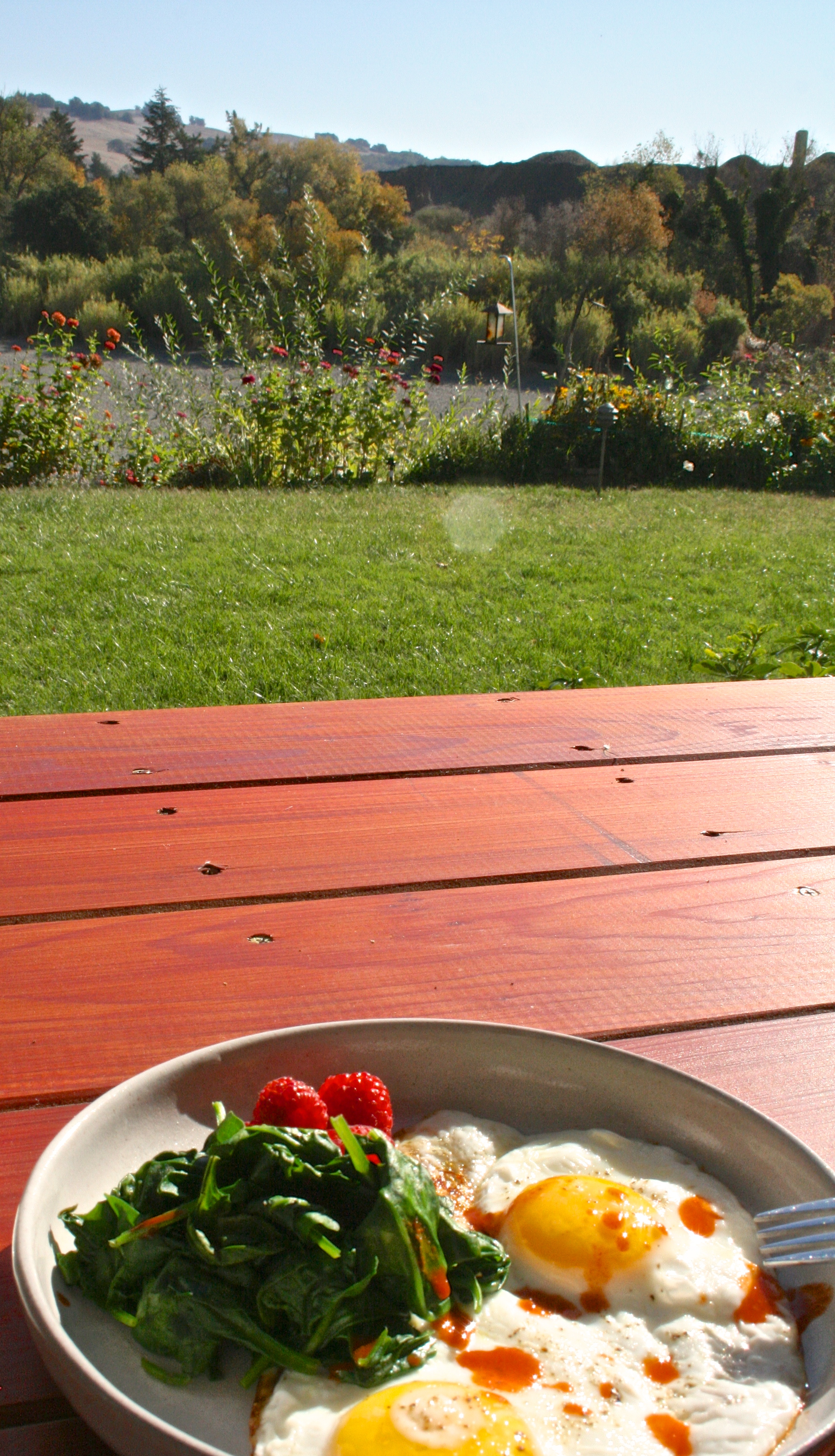 I got to wake up this morning to the birds chirping, not to my son whispering in my ear that he’s hungry. I got to take my time getting ready…alright you got me, I’m still in my pjs. I got to make coffee and my favorite breakfast (fried eggs + sautéed spinach + tapatio) without the Saturday morning cartoons in the background. I got to sit on the deck, enjoy the sun, the coffee and the breakfast.