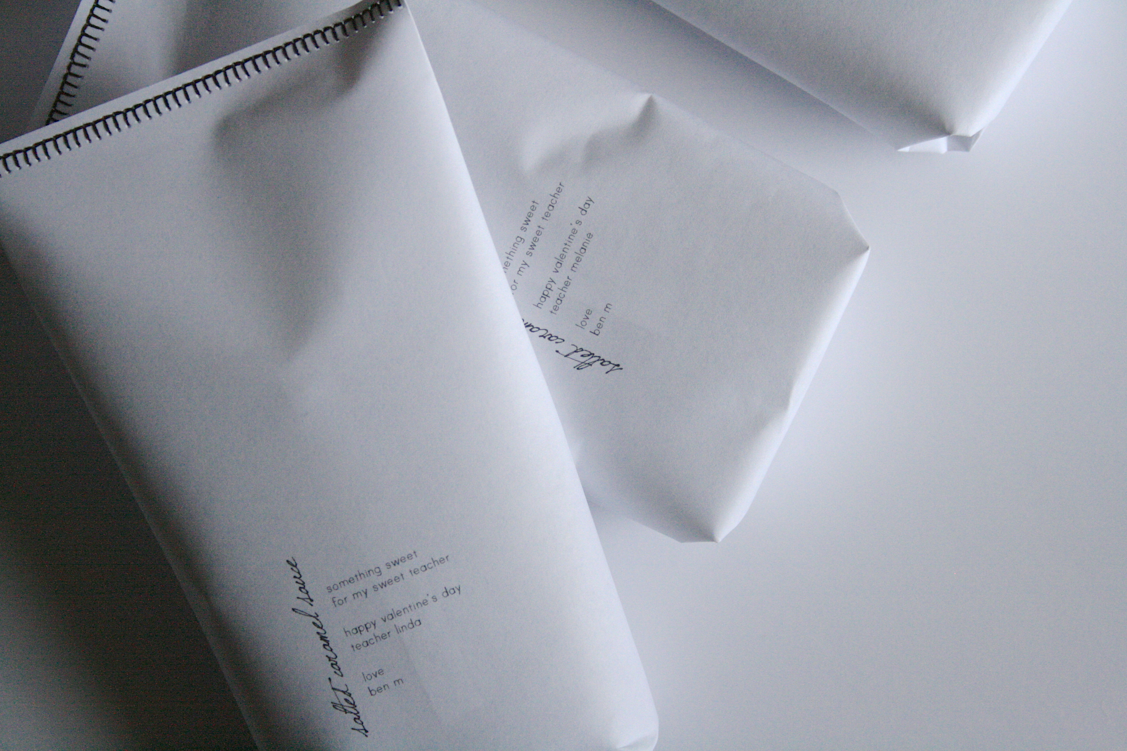 I usually don’t like to make the same gift twice. I tend to get bored with making the same things. For last year’s Christmas gifts, I made the teachers salted caramel sauce packaged with an apple. This year, they were still talking about how delicious the sauce was. So I took the “hint” and decided to make the sauce again, but this time with different packaging. Since I went with a sewn-paper route with the kids’ valentines this year, I decided to continue the theme. I was looking back on a few of my recent designs and I seem to be really into black and white right now 🙂