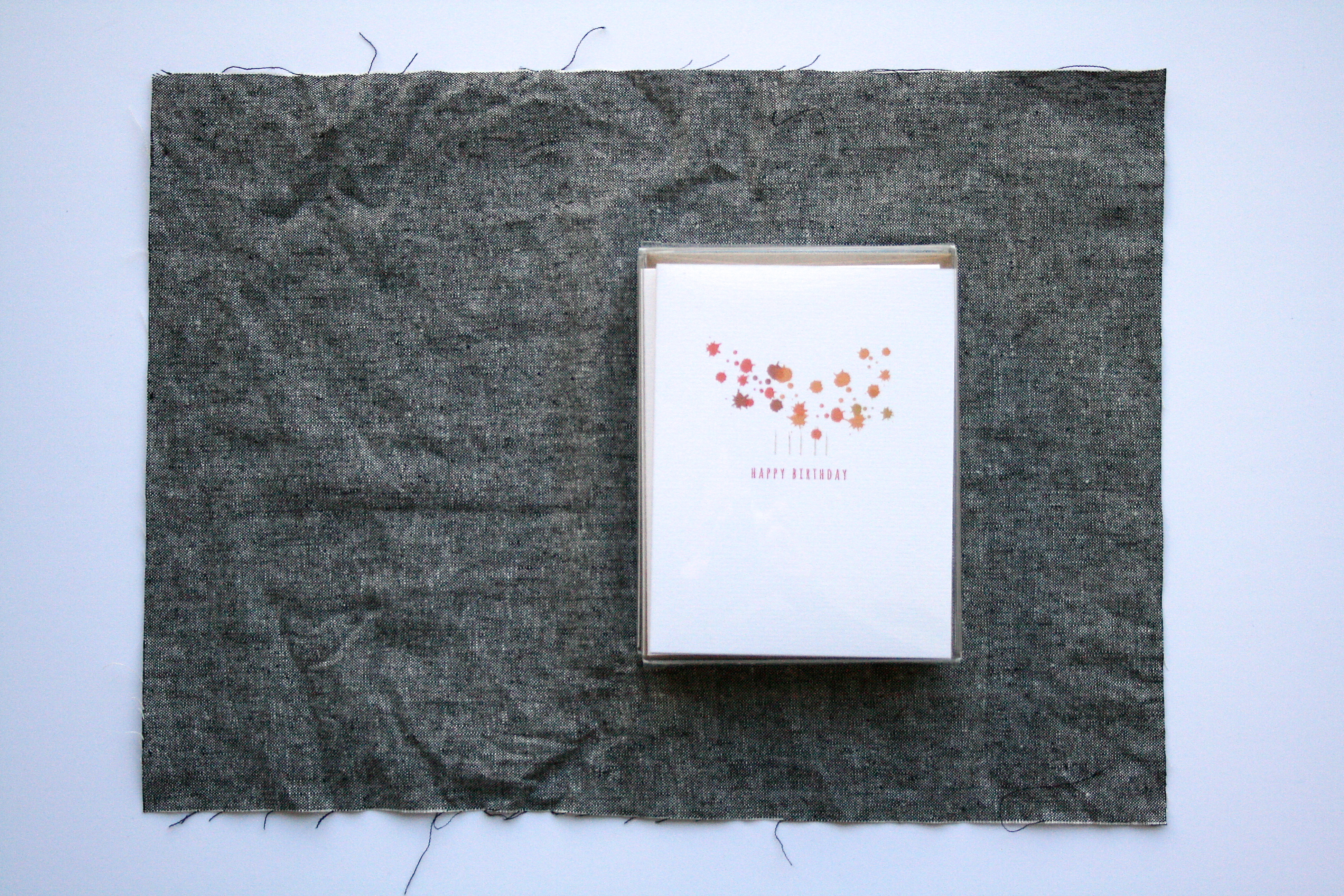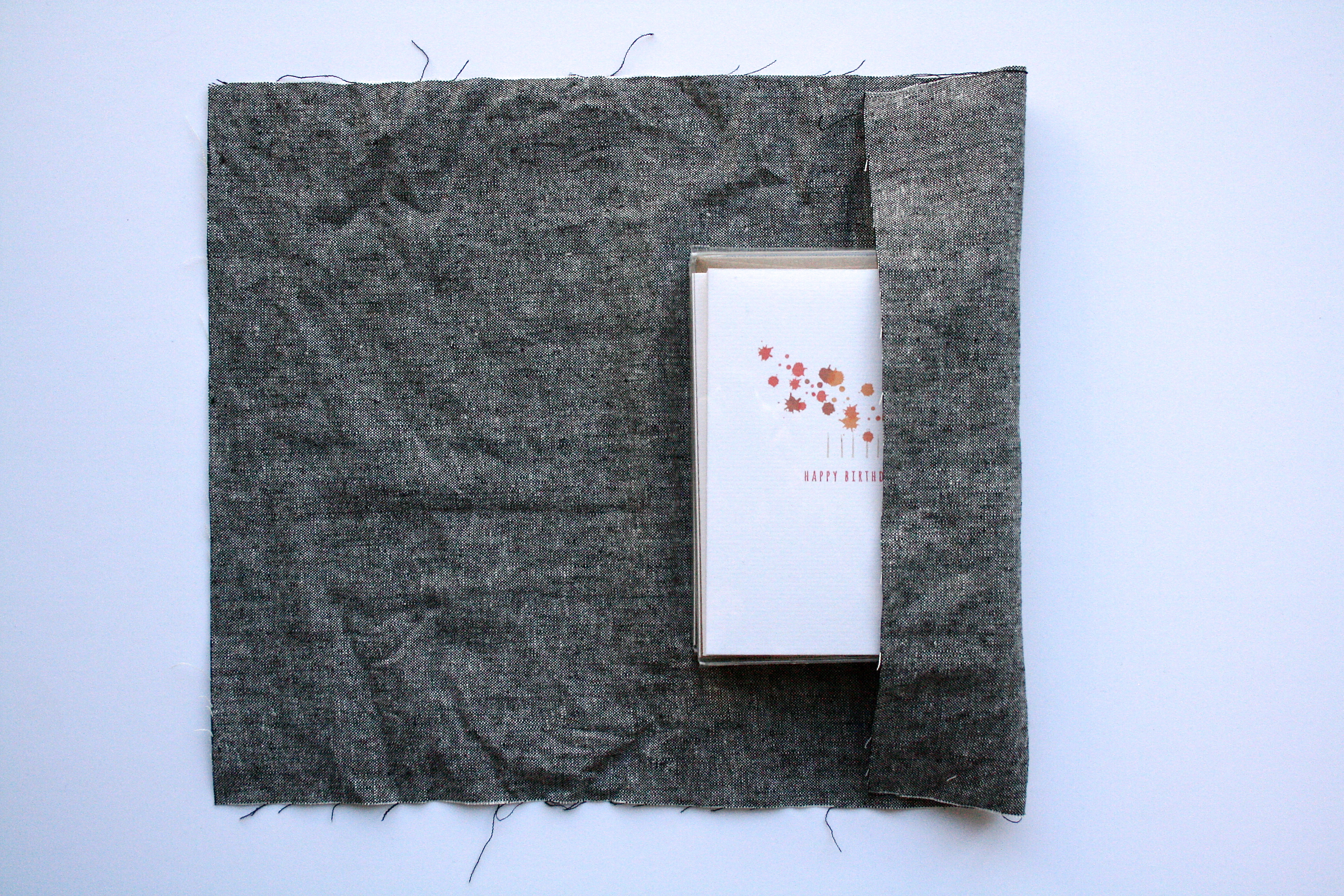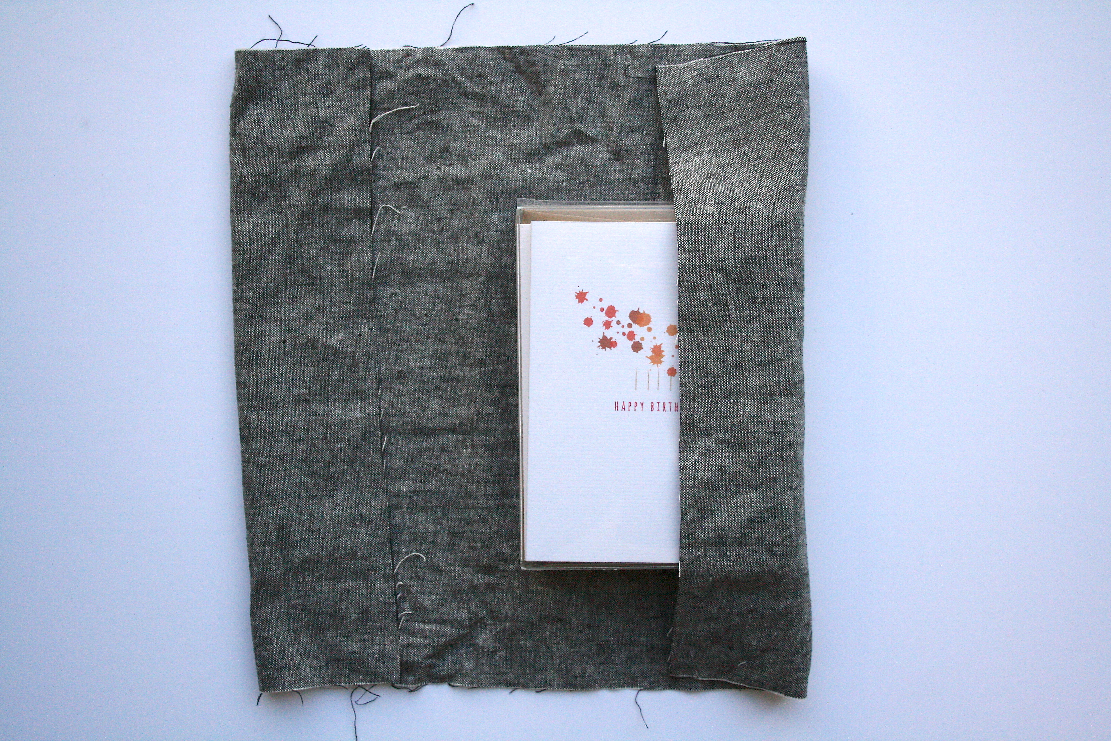 *The size of my card boxes are 6″ x 4.5″. I cut my fabric to be 11″ x 15″, if you want a reference point.