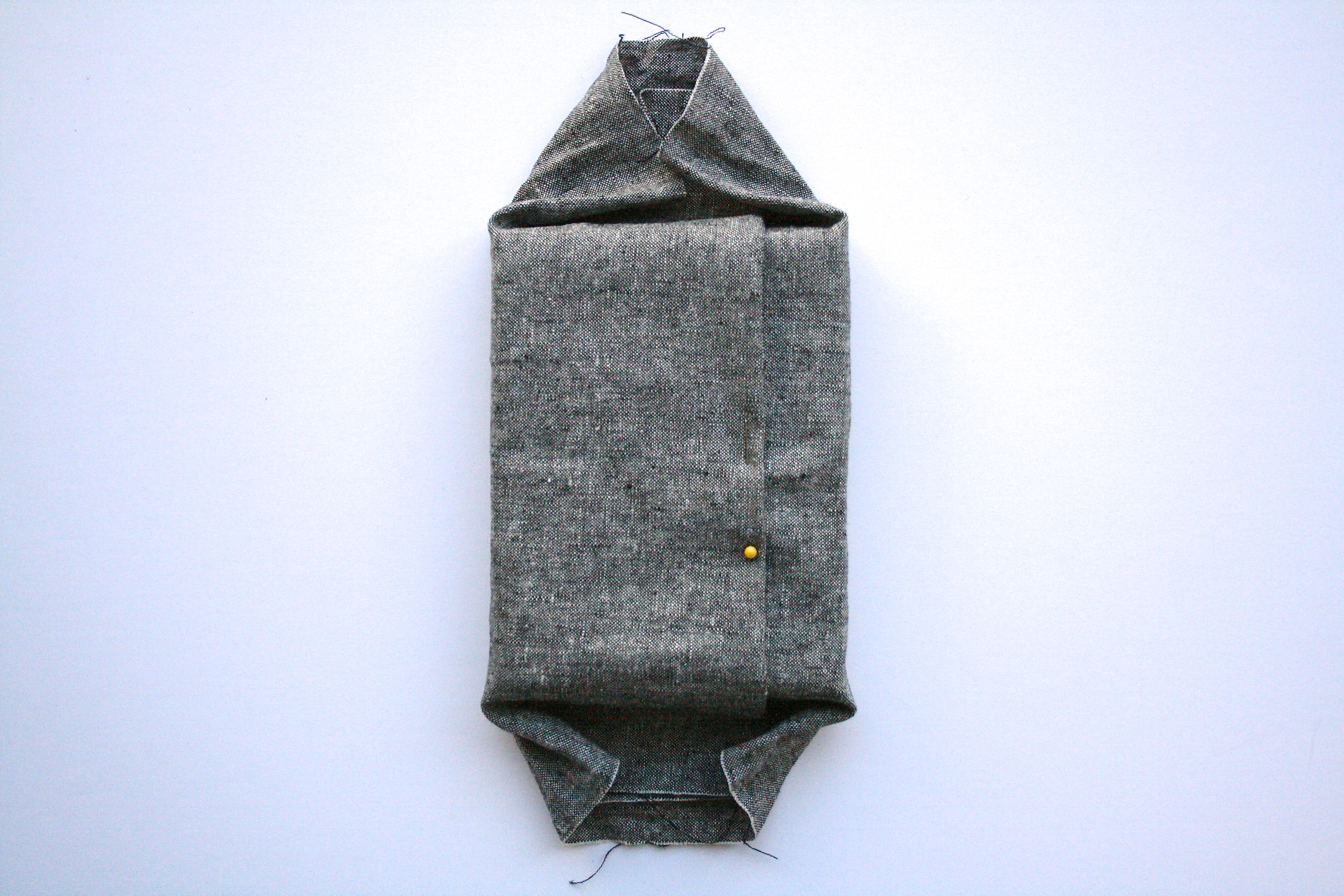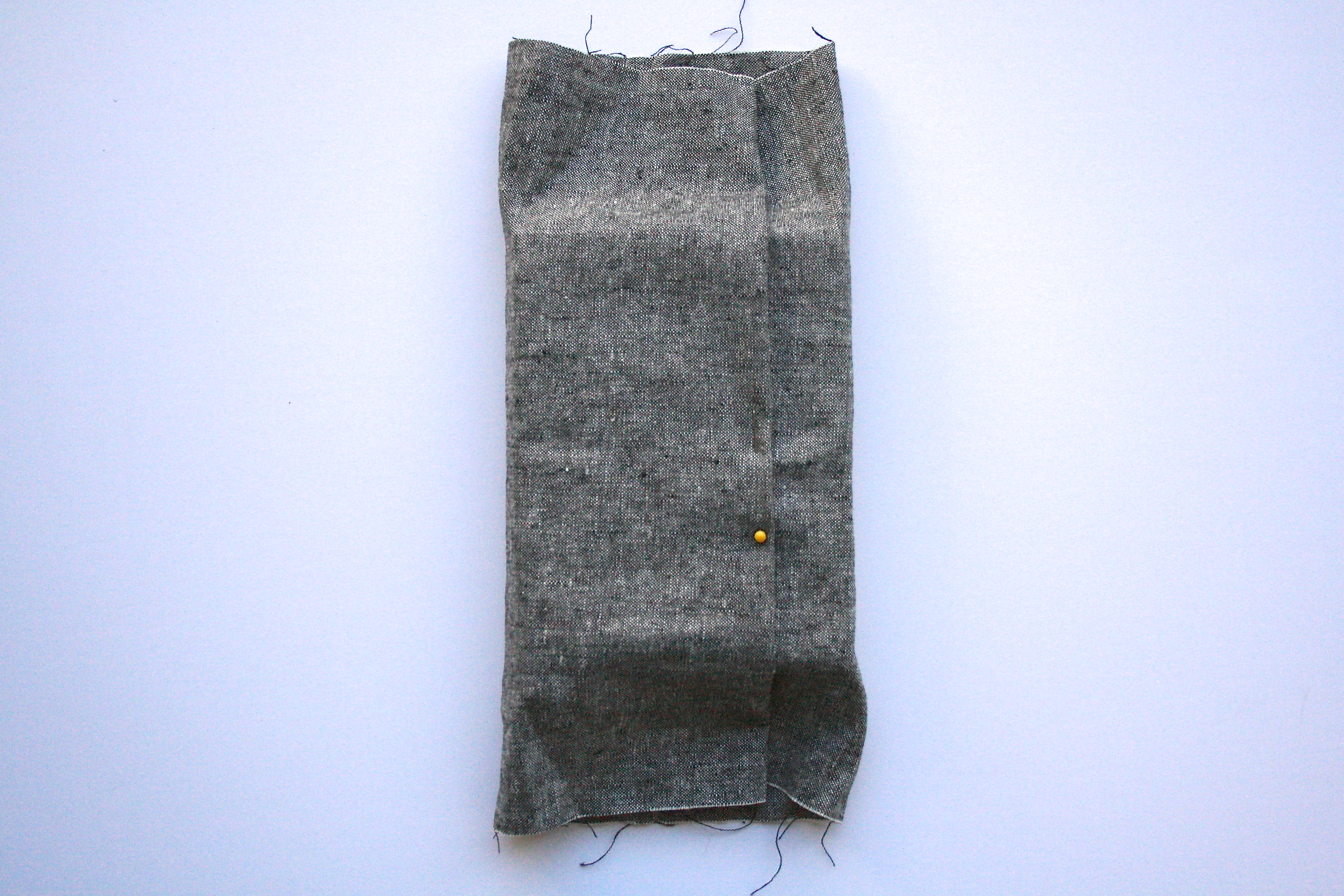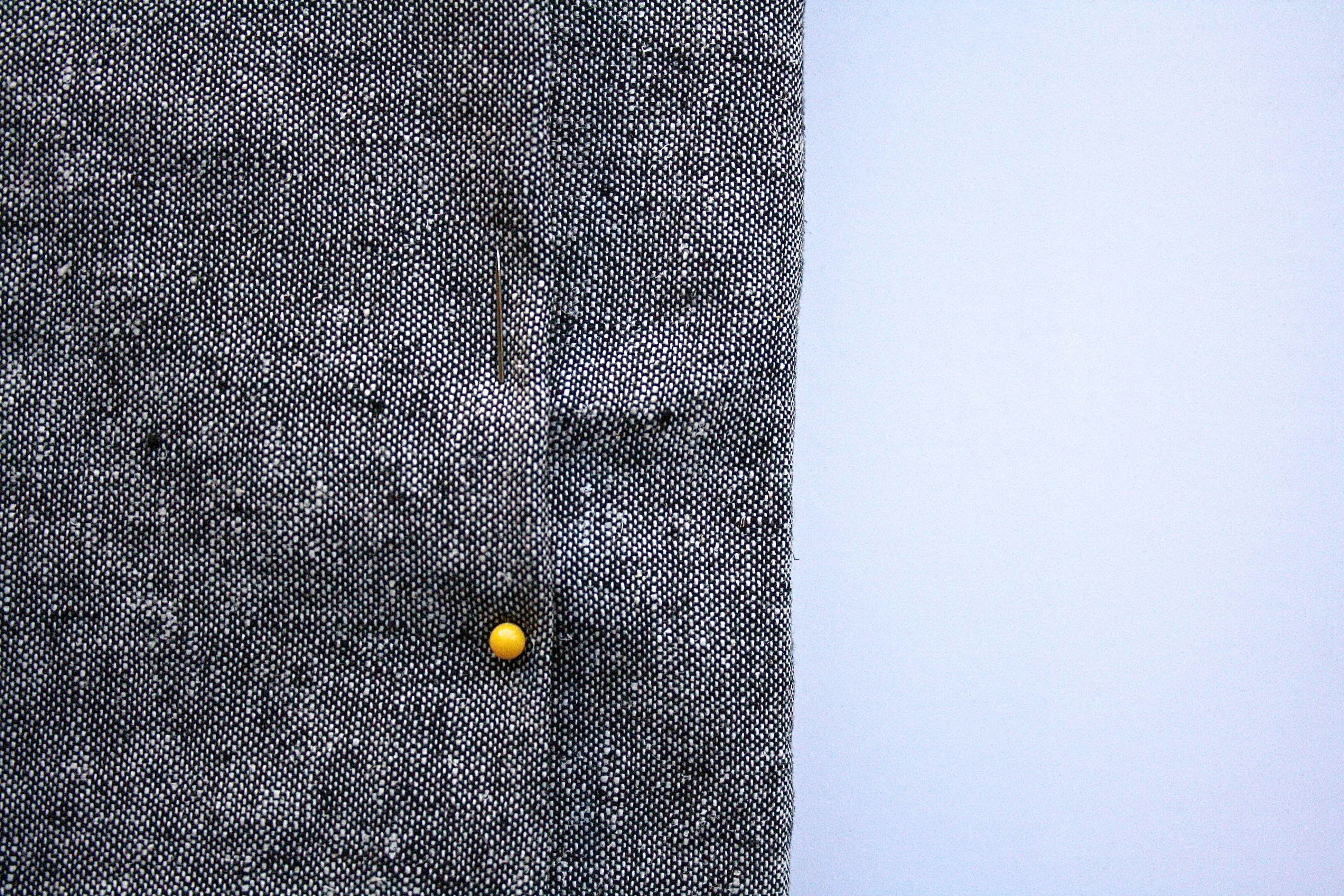 5. Fold over the left side so that the folded edge covers 2/3 of the product. Pull tight so you have clean edges. Pin it. Not Pinterest “pin it” but with an actual pin.