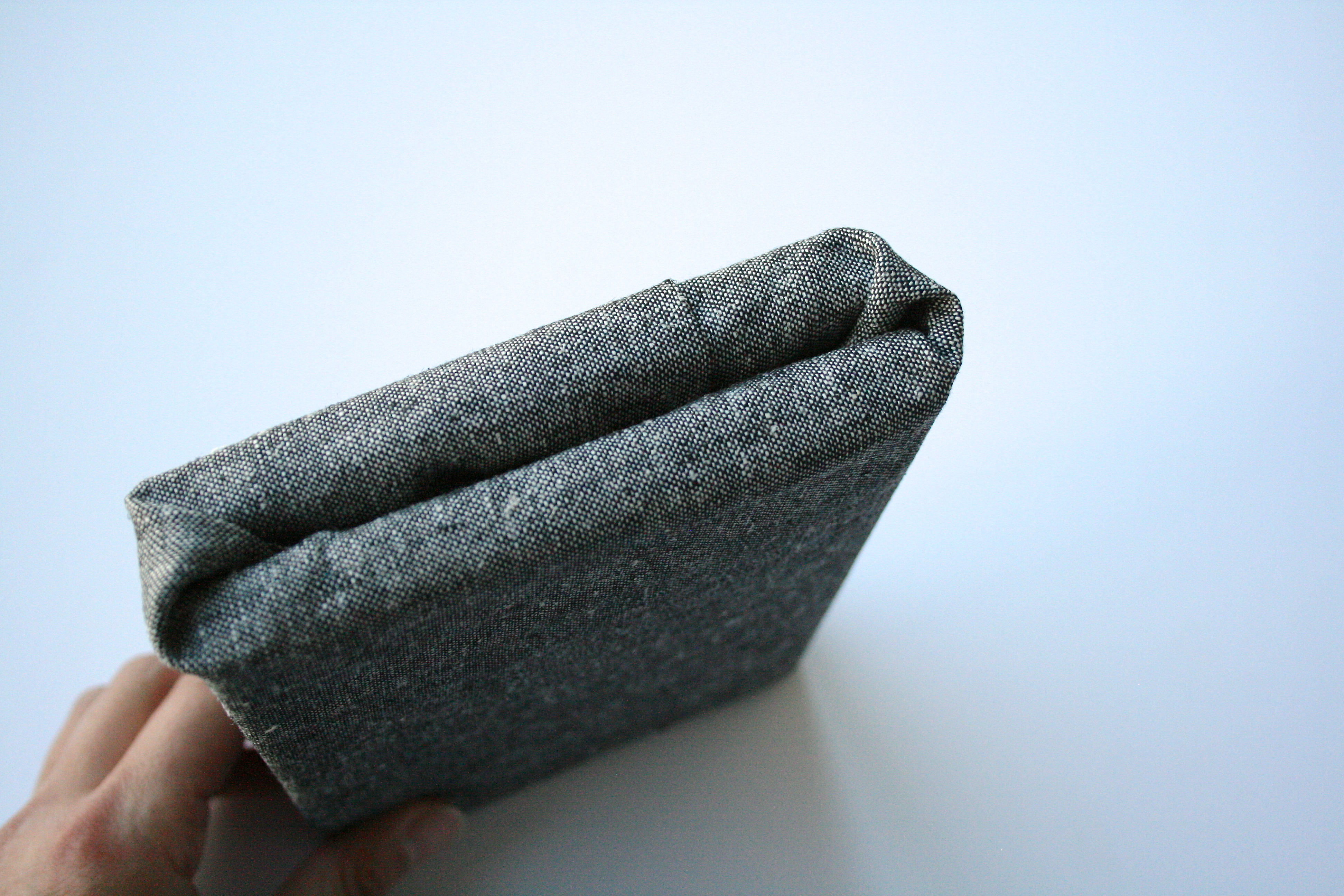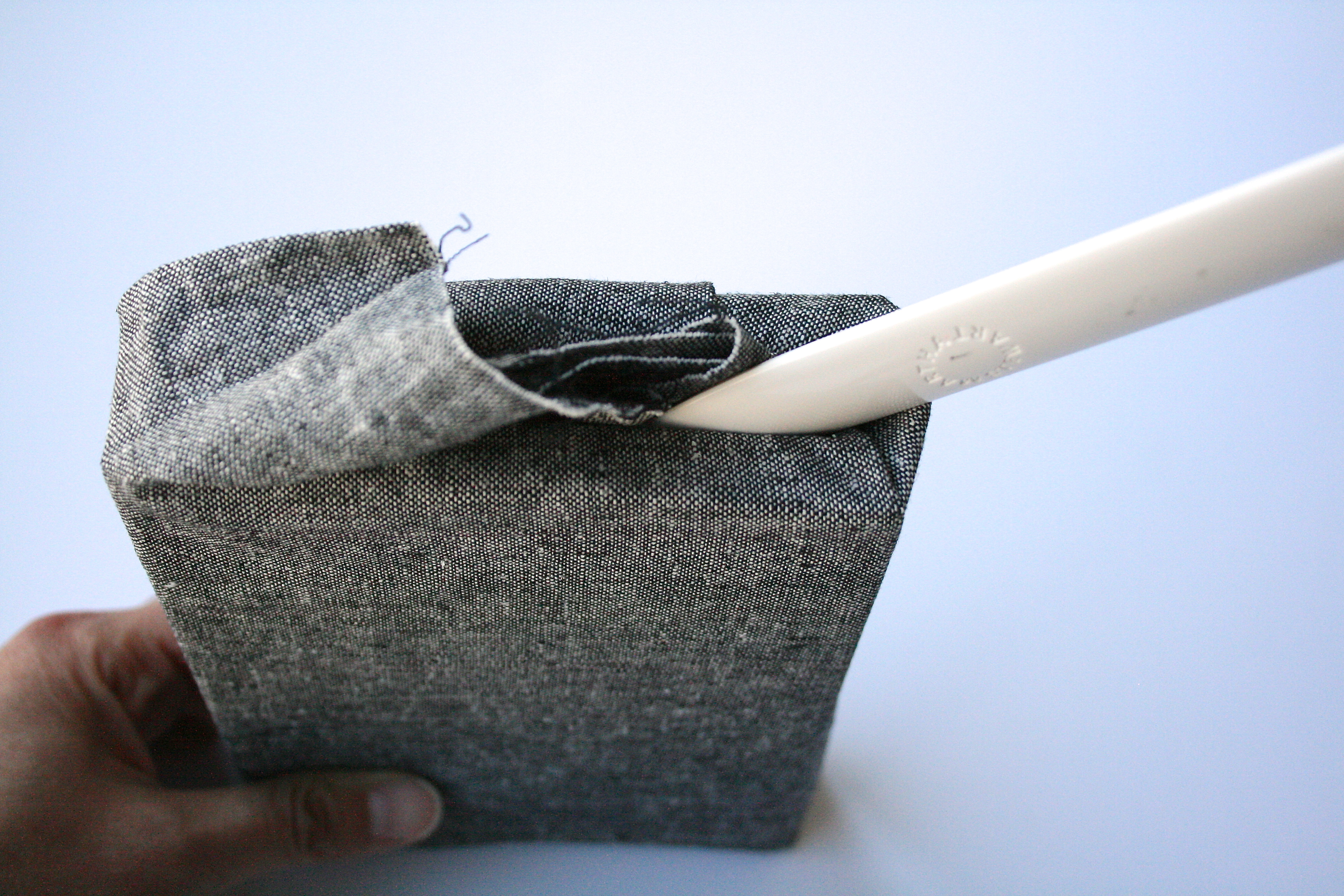 7. Stand it on one edge, and use your scoring knife to push in the fabric in between the two boxes. I found it easier if you start at one end. Just make sure you push it in all the way so you have a clean edge and fold. Repeat on the other side.