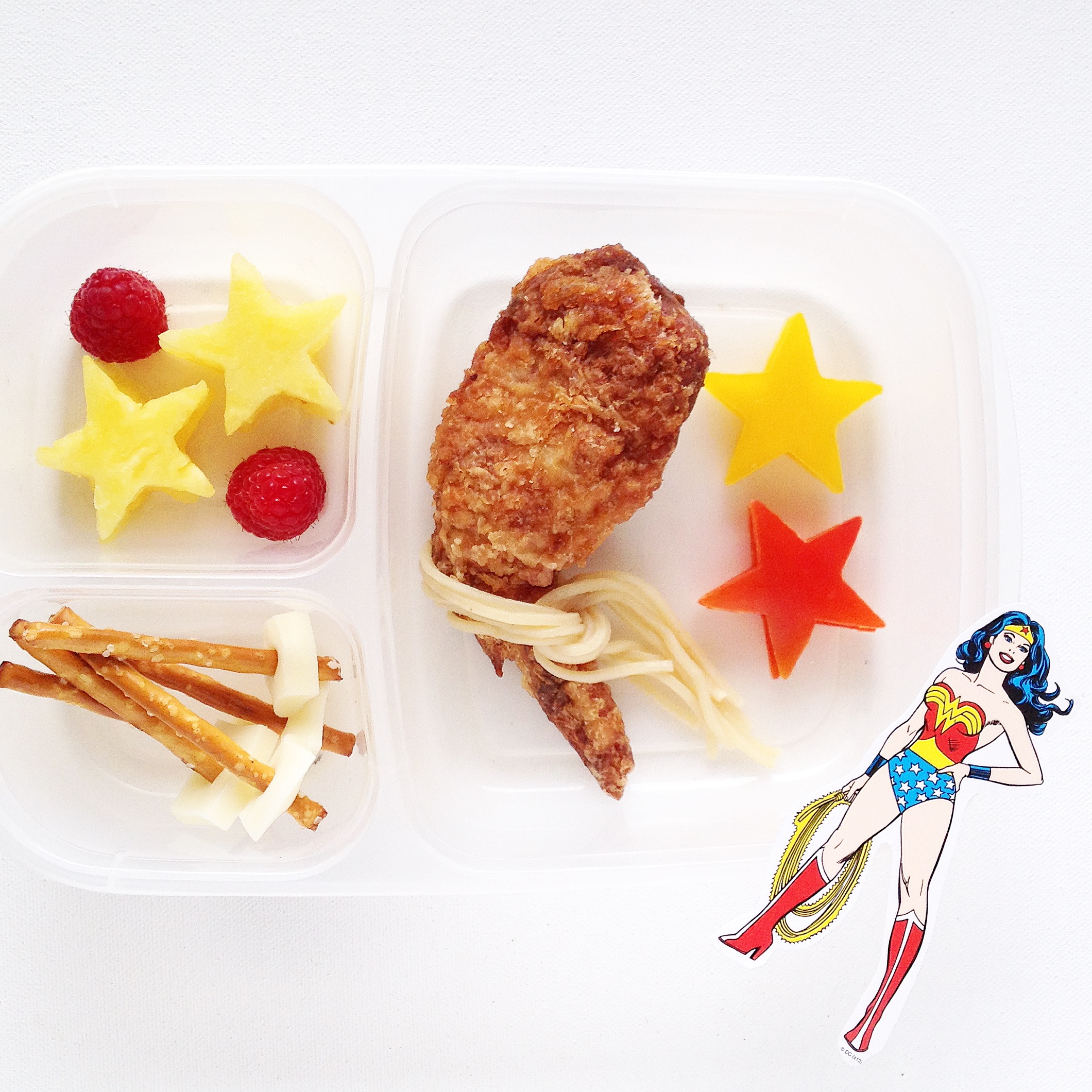 Wonder Woman: Evil stuffed chicken wing wrapped with Lasso of Truth noodles + Bell pepper and pineapple stars + Pretzel and cheese swords.