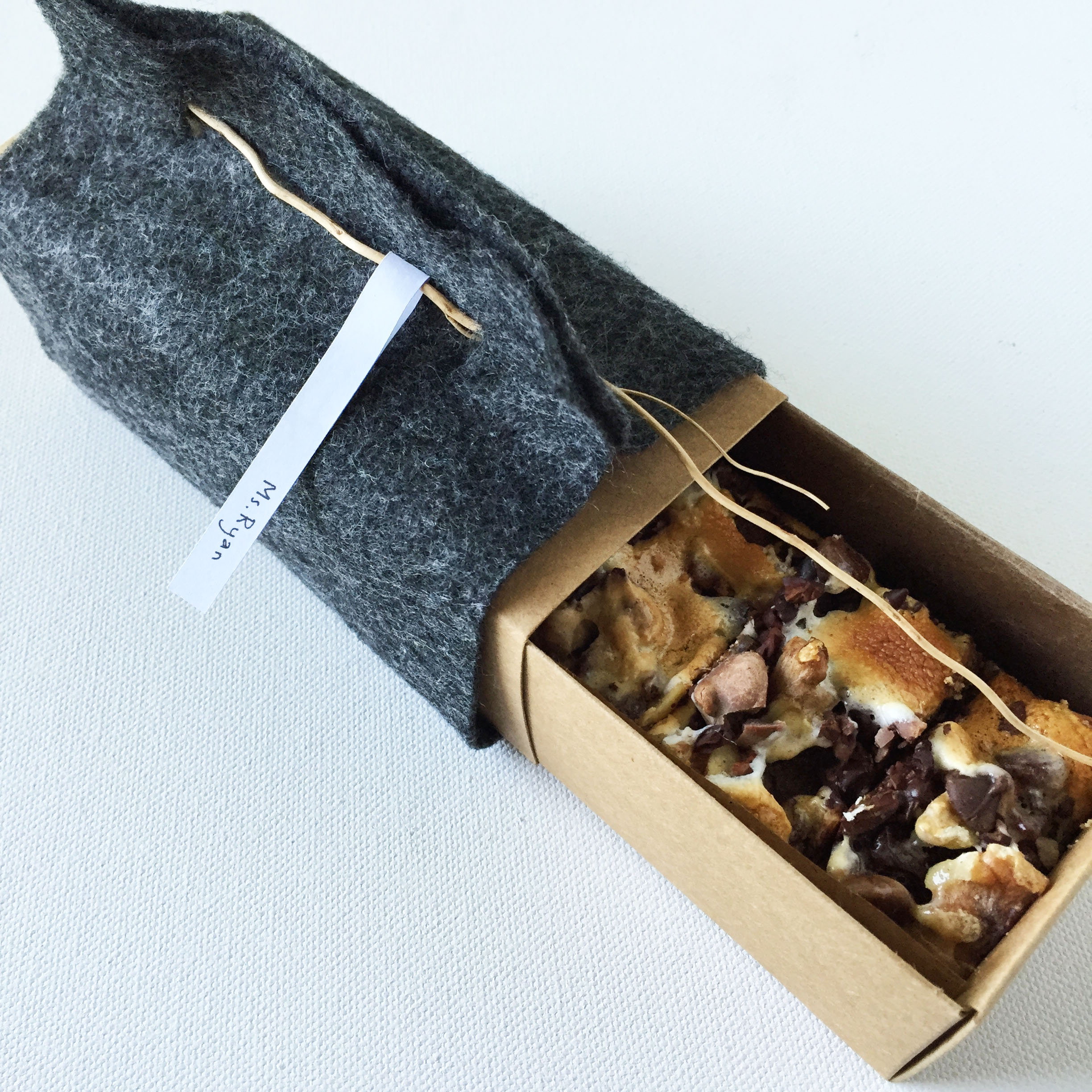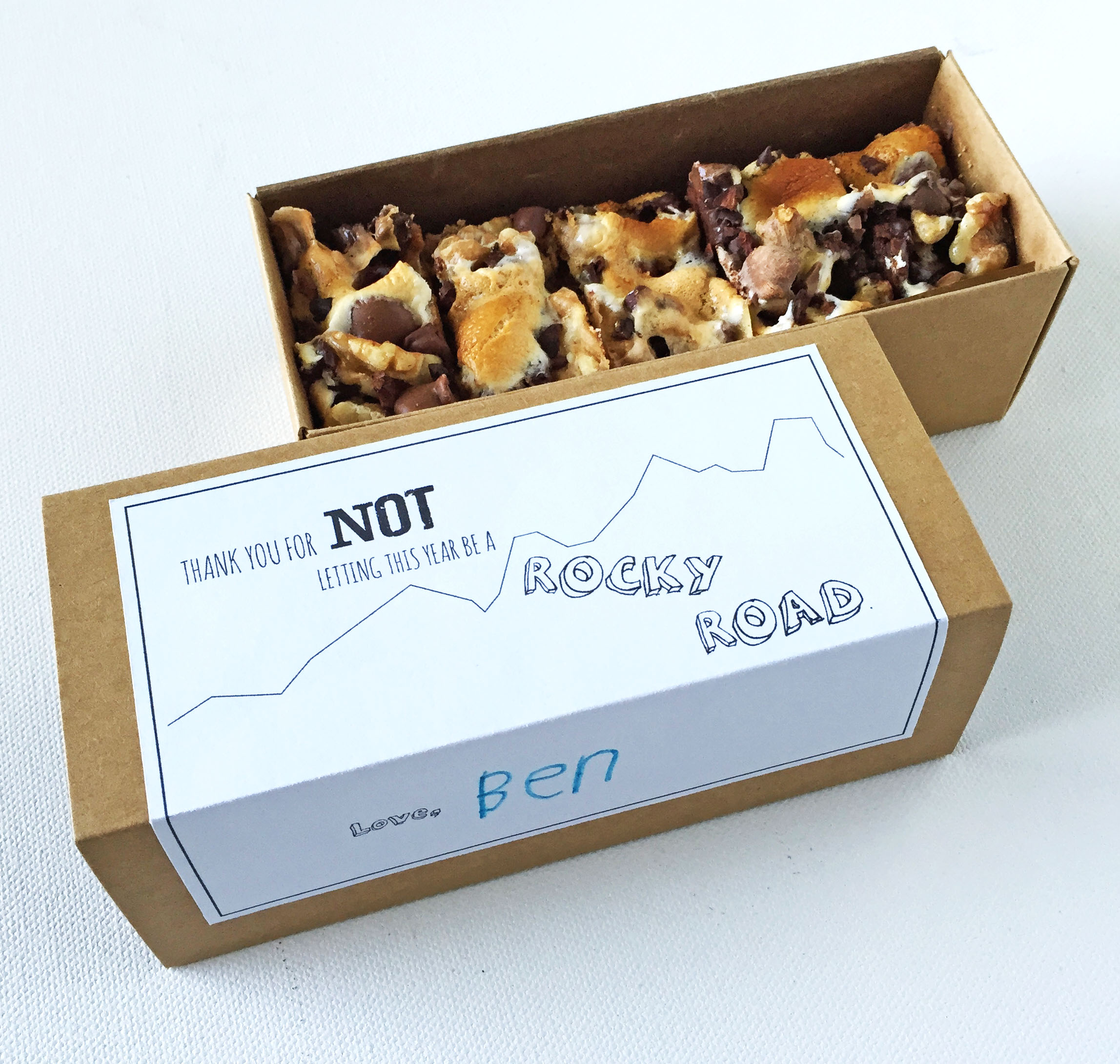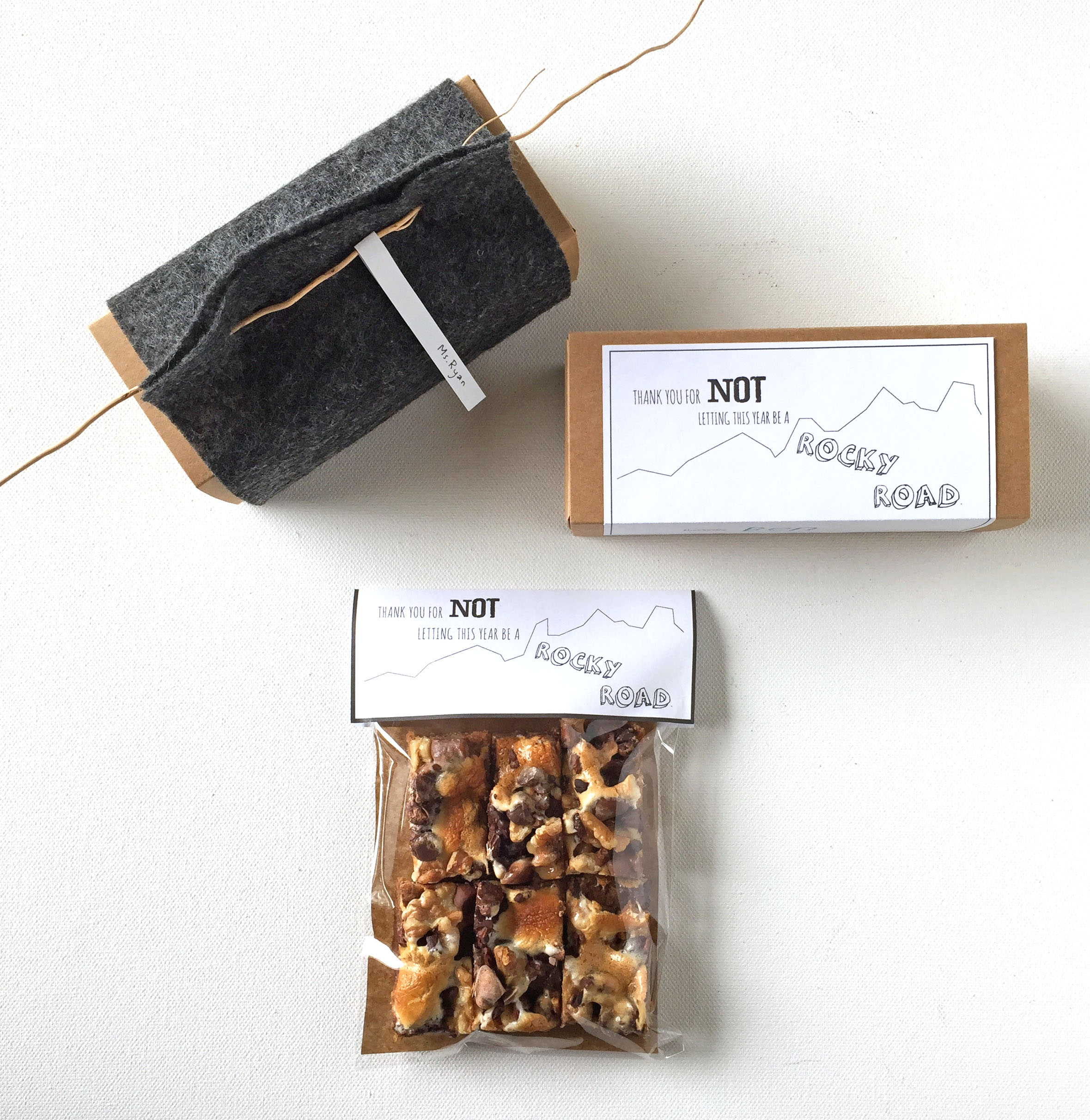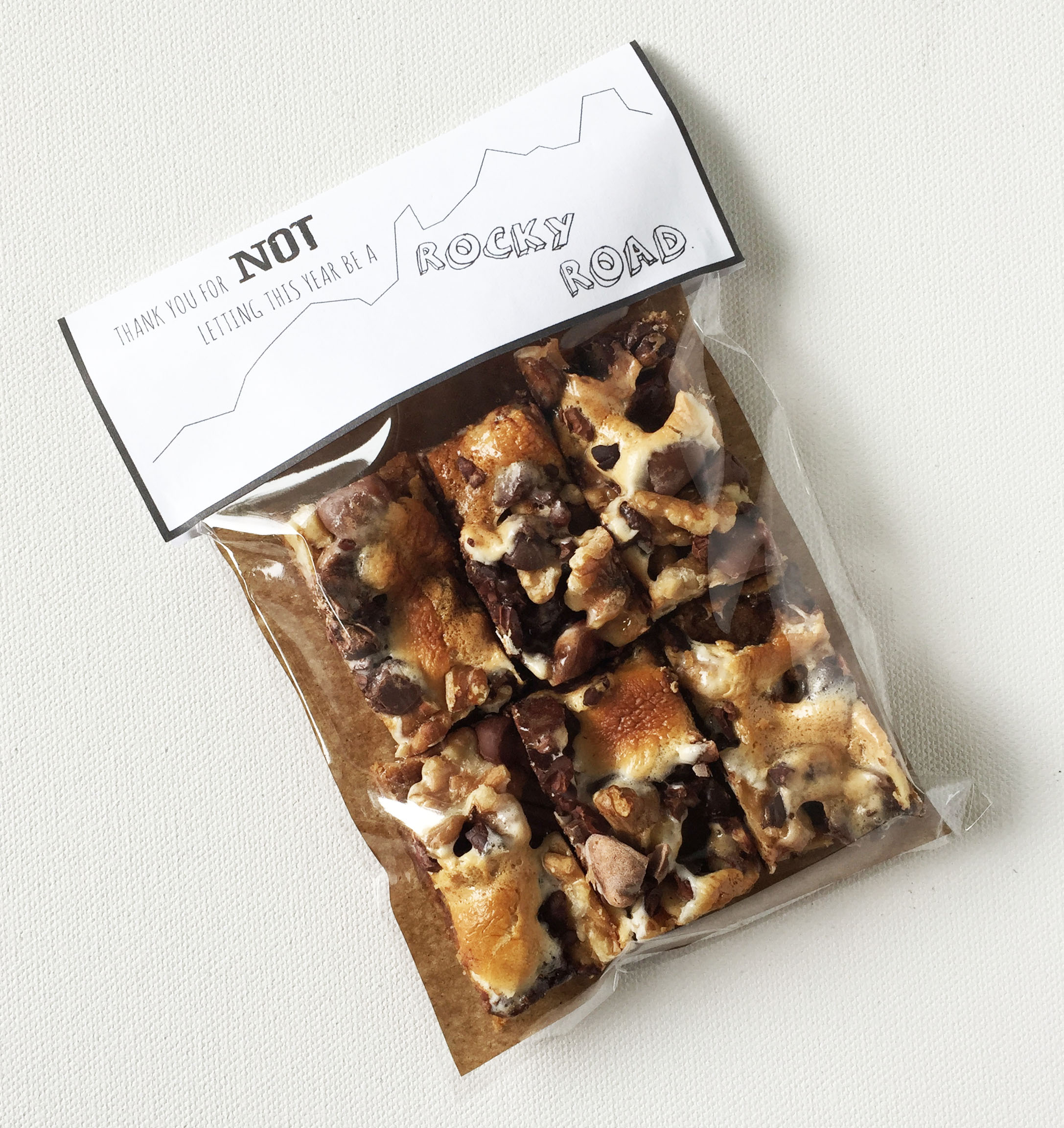 This is a variation of idea 1. If you don’t have a box or access to one, you can always go with the trusty good old bag (cellophane to paper). You can get these bags at Paper Mart and craft stores. Line the bag with parchment and fill with the bars. Close the bag. Make a label, and tape or staple onto the bag. Here is a free printable Rocky Road Label. Super inexpensive and easy. You don’t need any special tools, not even a color printer.