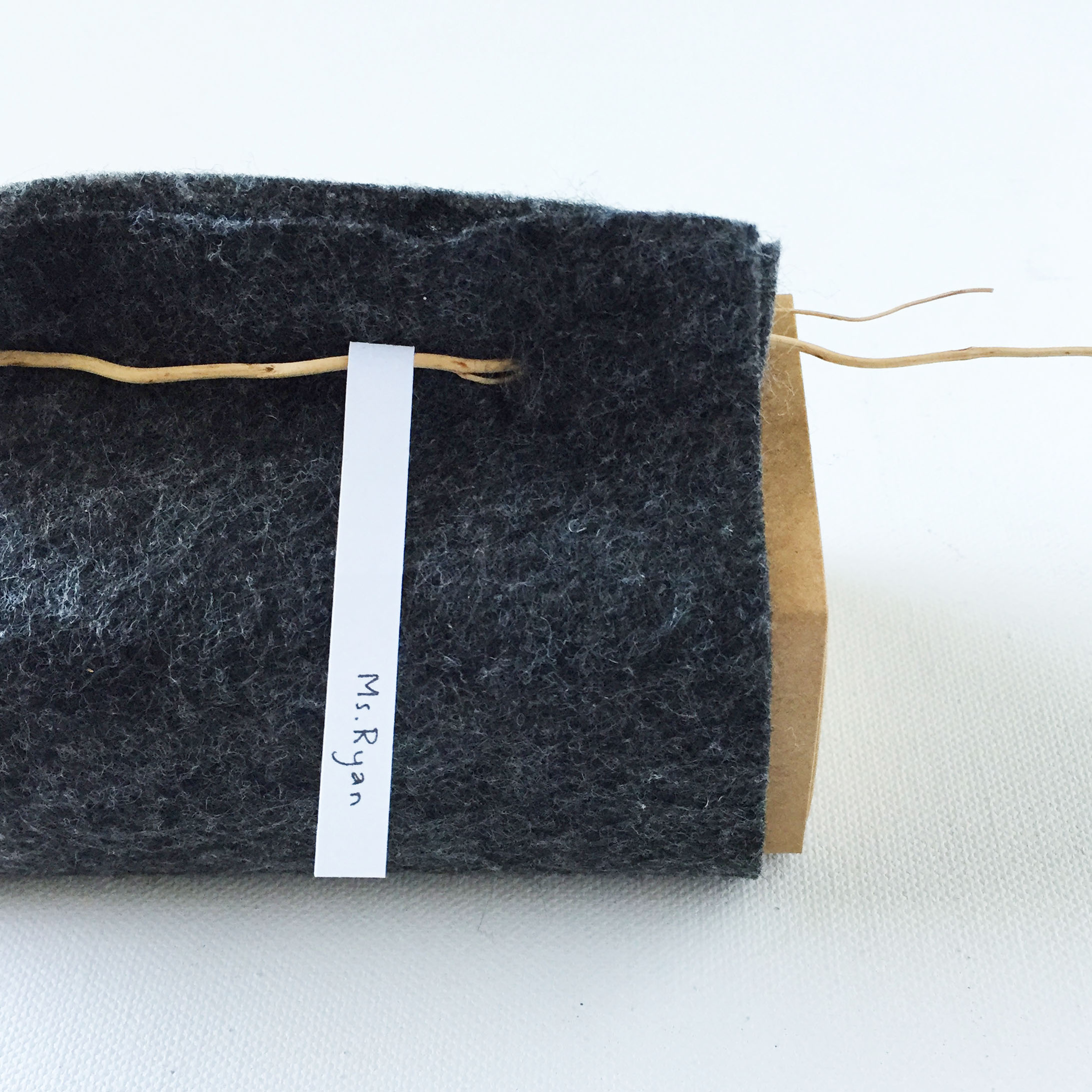 This uses the same sliding box as Idea 1 but I use felt to wrap around the box. Remember, you can use any size box. You can purchase really inexpensive 9″ x 12″ felt sheets in fabric and craft stores. Sometimes they’re as low as $0.29 per sheet! You can use any fabric but I like felt since the ends don’t fray. No need to sew. Just cut and go! Cut the fabric to the corresponding size of your box. Holding the top portion of the fabric, use xacto knife to make small slits. Make sure the knife went through the second layer of felt. Insert a twig through the holes to keep the felt together. Make a label (handwritten totally works!) and wrap around the twig and tape or glue. All done!