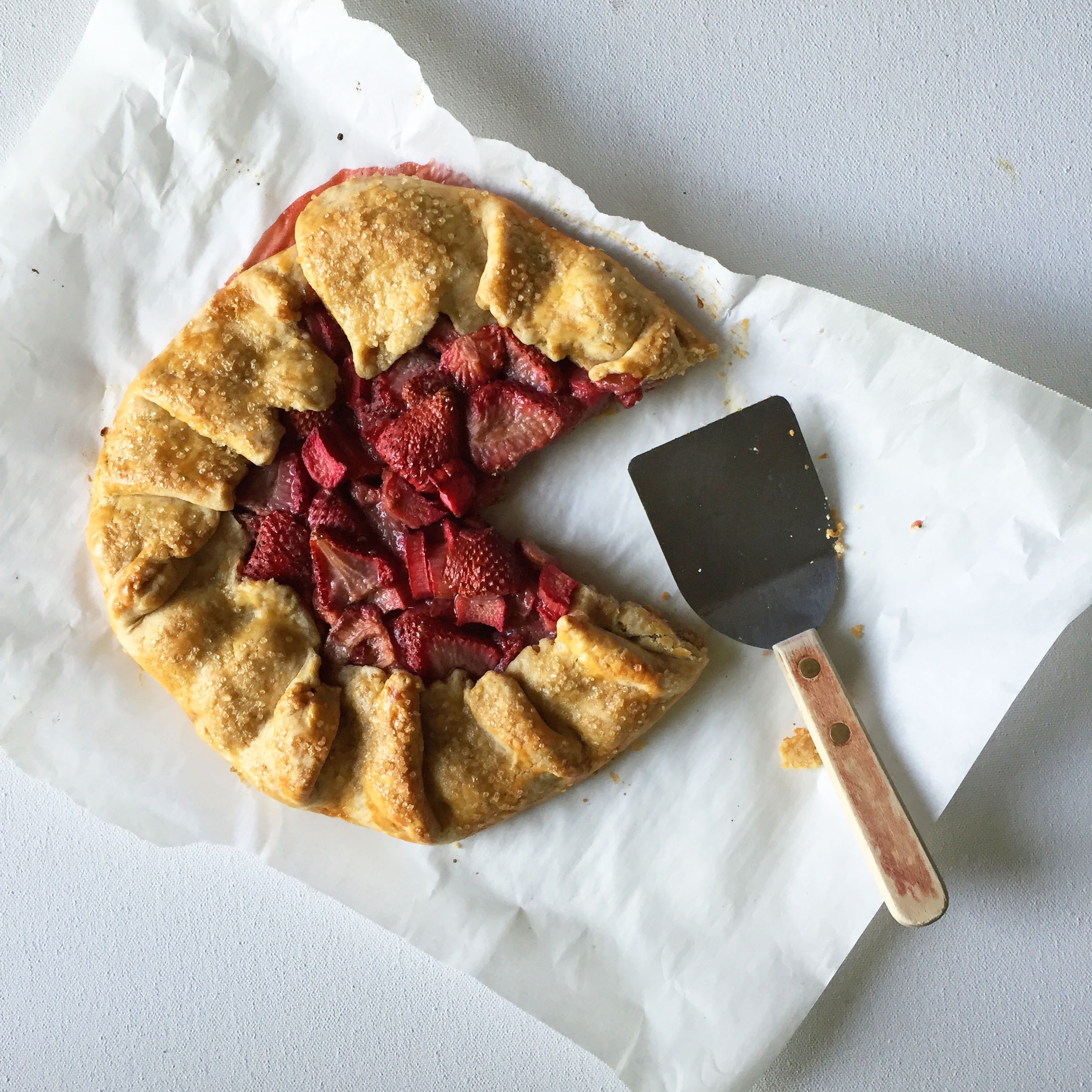To make the filling, in a medium bowl, combine the strawberries, rhubarb, lemon zest and juice, 2 tablespoon of flour and 2 tablespoon of sugar. Let it macerate while rolling out the dough. Combine the leftover flour and sugar in a small bowl. Roll out the dough to roughly 12-14″. Evenly, sprinkle the flour and sugar mixture over the dough. (This “catches” all the juices released by the berries so the crust doesn’t get too soggy.) Spoon in the filling leaving about 3-4″ edge. Gently fold in the edges toward the middle forming a “crust”. Brush on the egg wash on the crust and sprinkle with turbinado sugar, if using.